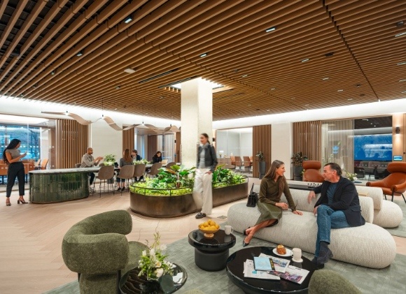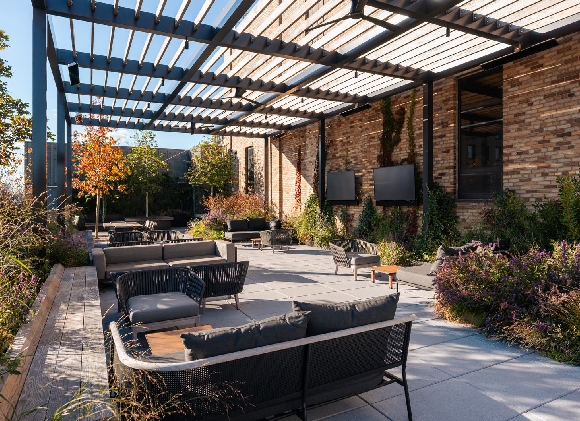 Perched atop 555 Greenwich, the rooftop terrace offers sweeping views of the Hudson River and the Manhattan skyline, creating an inspiring backdrop for work or relaxation